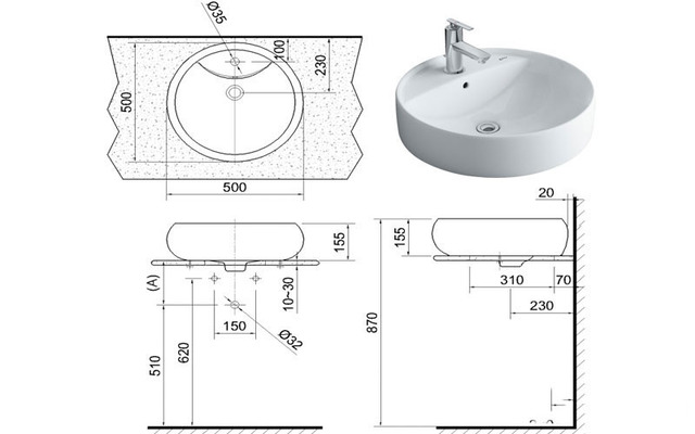 Với thông số trên, chậu rửa mặt âm bàn sẽ lừ sự lựa chọn hoàn hảo cho những không gian có diện tích vừa phải. Chậu thường được đặt trên mặt bàn đá có chiều rộng tối thiểu là 600mm.