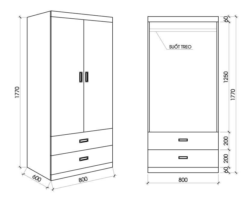 Kích thước của tủ quần áo 2 buồng